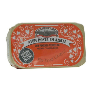 Thon entier simplement préparé avec de l'huile d'olive et quelques poivrons rouges, mis en conserve par la Conserverie artisanale La Gondola à Matosinhos au Nord de Porto.