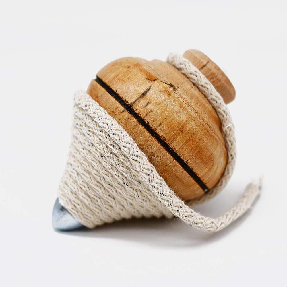 Jolie toupie en bois avec une base en métal et un lanceur en coton.