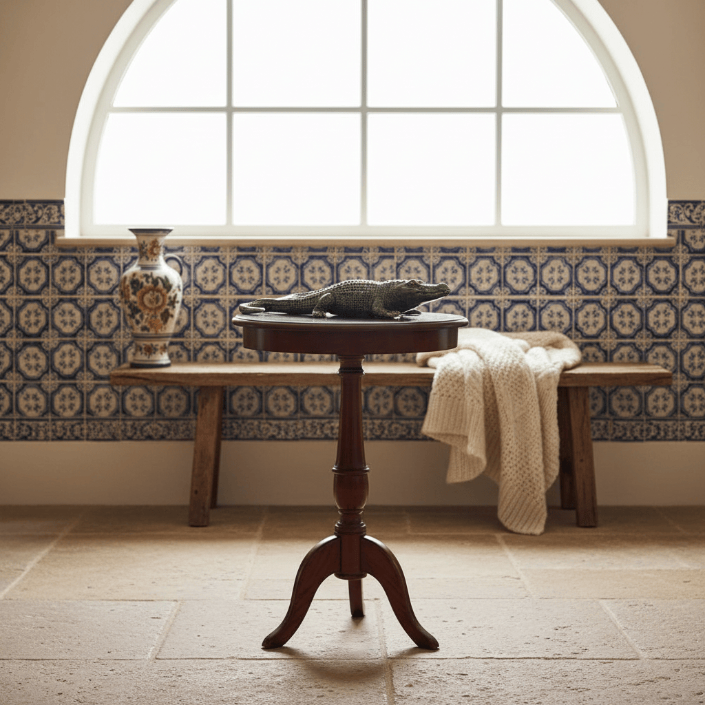 Ce crocodile en céramique s'impose naturellement comme un objet trouvé dans une maison portugaise, entre nature et humour.