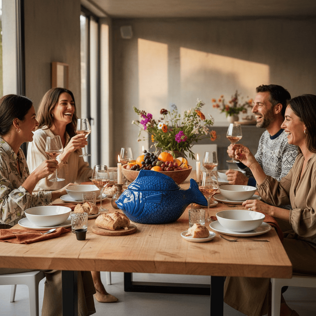 Posée au centre de la table, cette soupière en forme de poisson attire immédiatement les regards. Sa silhouette expressive, ses couleurs lumineuses et son esprit joyeux évoquent les grandes tables conviviales du Portugal, celles où l’on partage un plat généreux en famille ou entre amis.