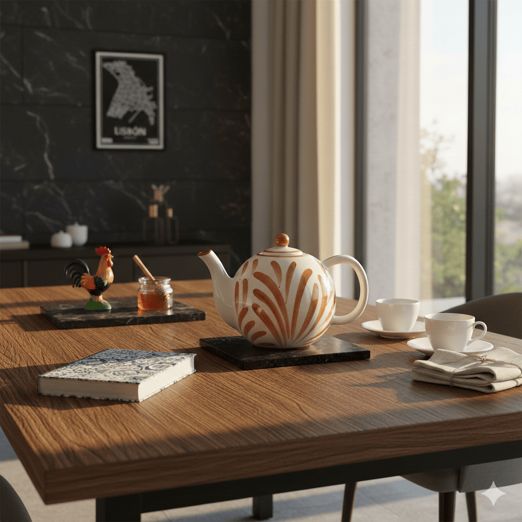 Inspirée par le vol libre des andorinhas (les hirondelles portugaises), cette théière évoque le Portugal, le calme, le temps suspendu. Chaque courbe est pensée pour l’usage, chaque décor pour l’émotion.