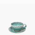 Ensemble tasse et sous tasse en grès fin vert de la collection Madeira au design inspiré par la nature avec une surface craquelée qui imite l'effet de la lumière filtrée.