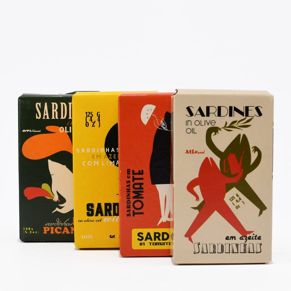 Ati Manel est le nom du grand-père de l'entrepreneur qui a relancé cette marque de conserves fabuleuses née au début du 20e siècle, près de Figueira de Foz, entre Porto et Lisbonne. C'est cet héritage qui dicte aujourd'hui les décisions de l'entreprise : L'exigence de qualité des ingrédient et la recherche des meilleures conditions de production pour les préserver. Le design des emballages est né des vieilles planches graphiques retrouvées dans la maison du grand-père.