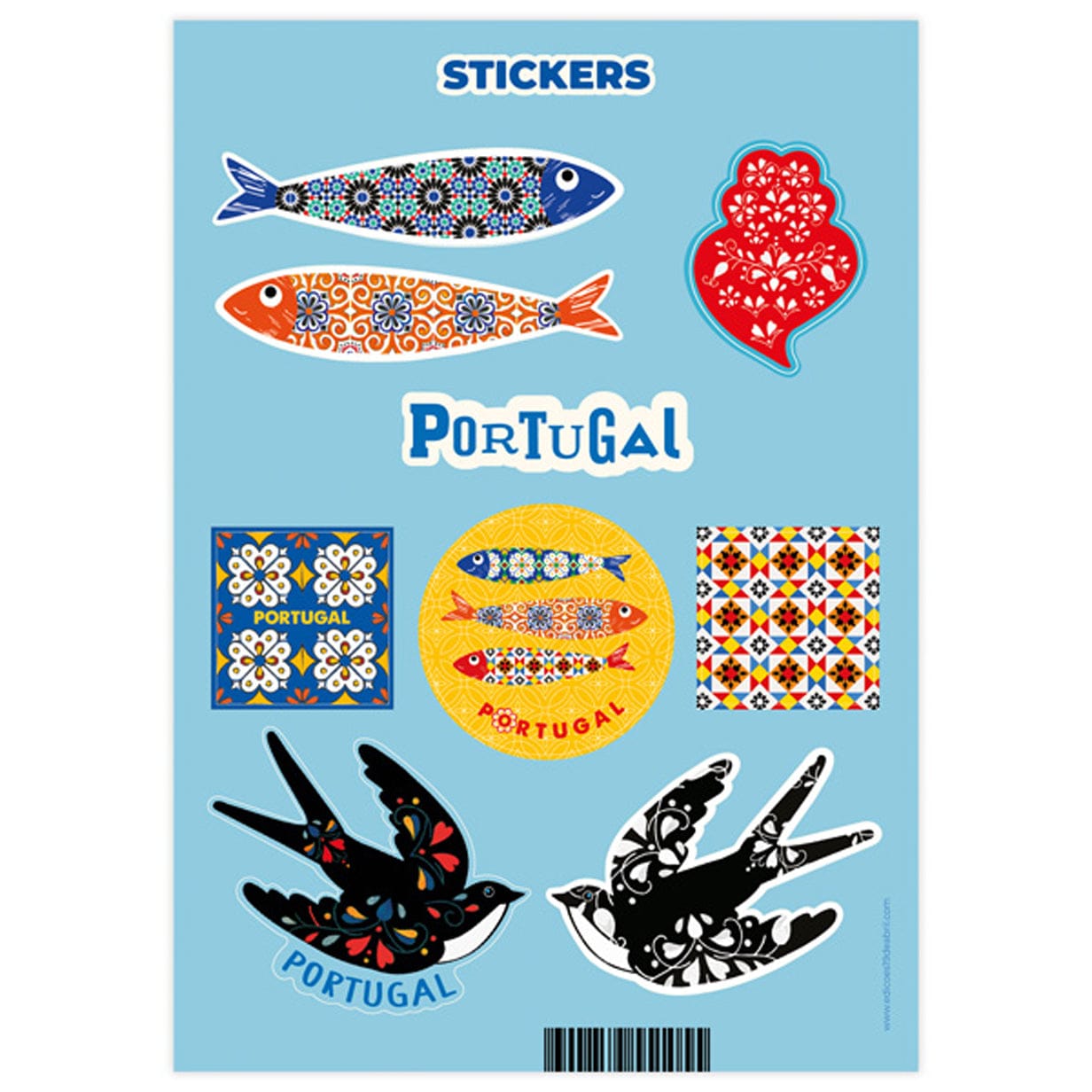 Planche d’autocollants rassemblent les icônes du Portugal : Azulejos graphiques. sardines populaires, hirondelles porte-bonheur, cœur de Viana chargé d’émotion. Des icônes reconnaissables et ancrées dans la culture portugaise.