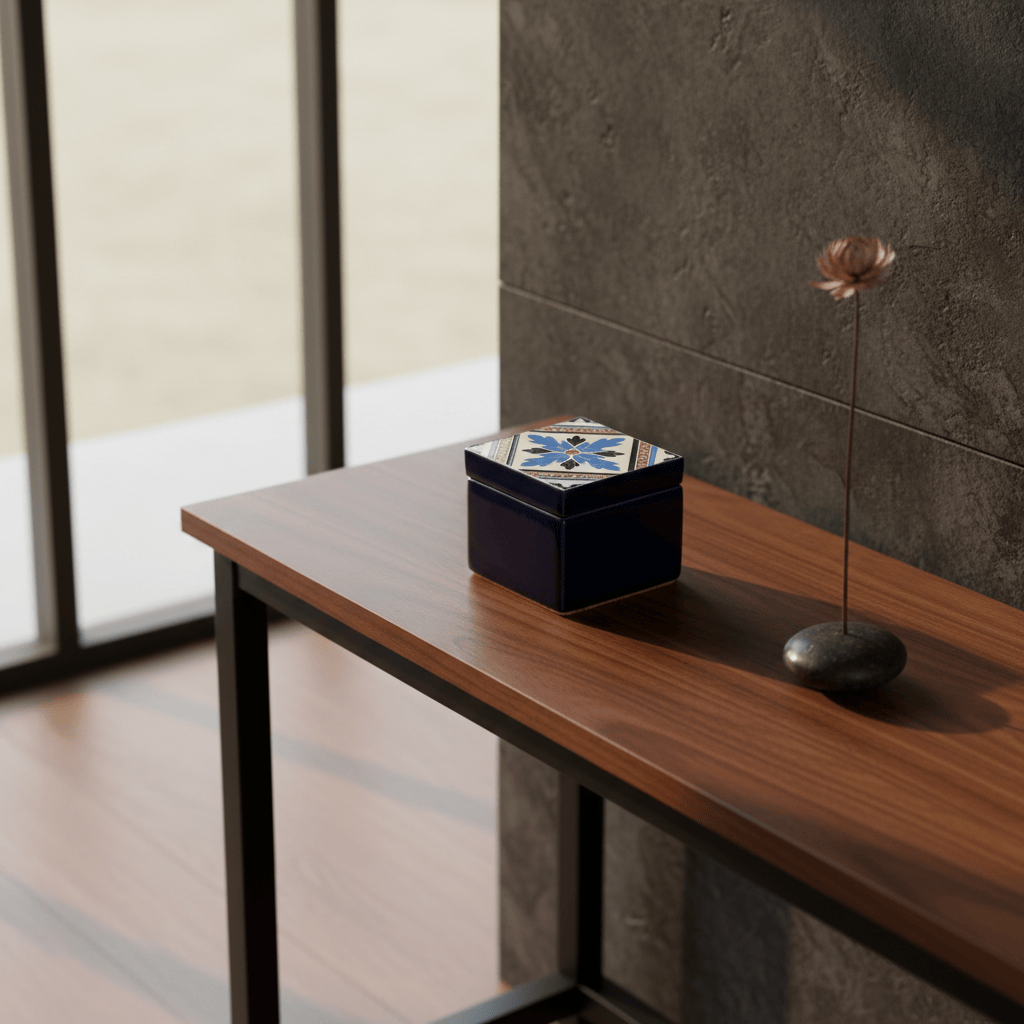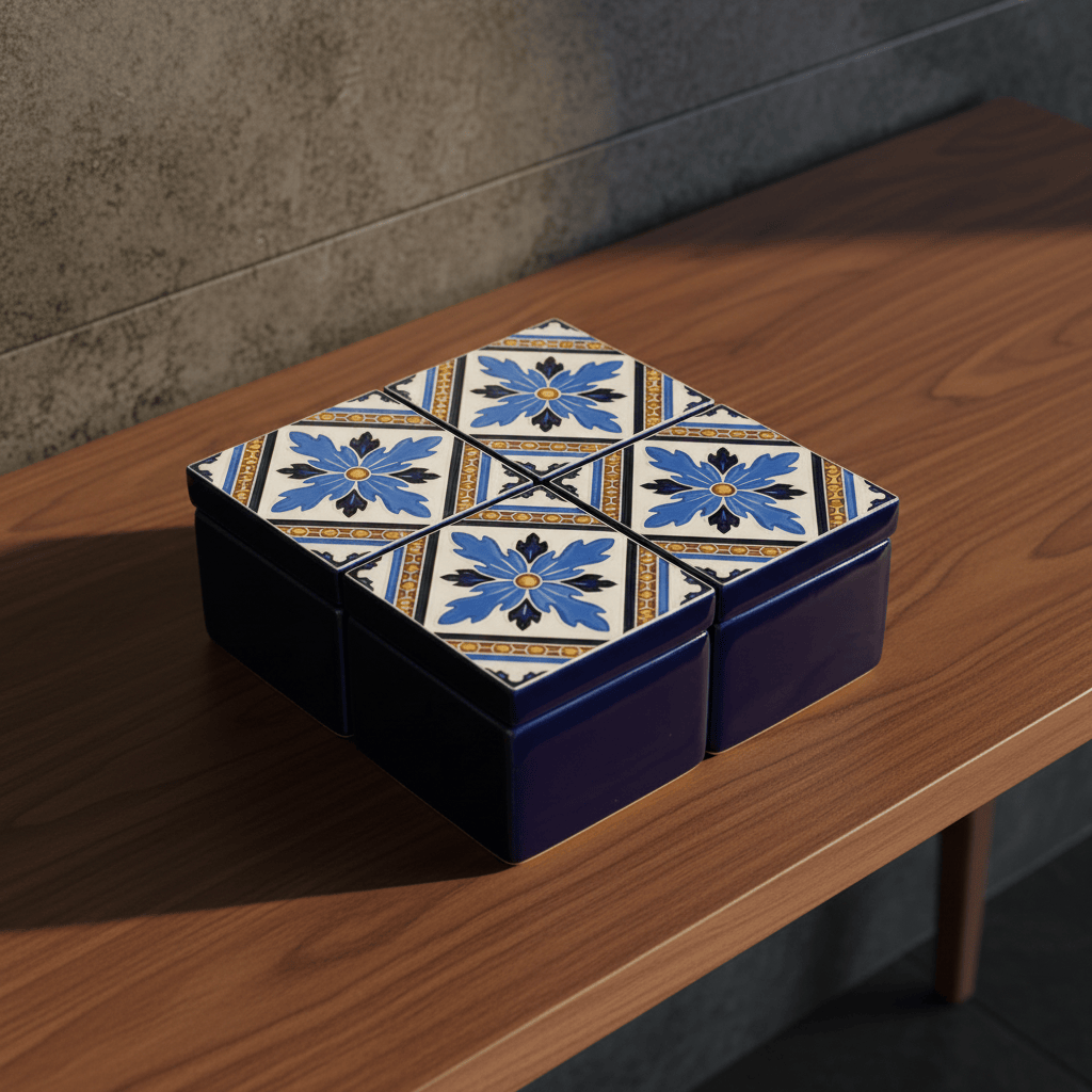 L'esthétique de cette boîte puise ses racines dans la tradition des azulejos hispano-mauresques, un savoir-faire séculaire introduit dans la péninsule Ibérique dès le XVe siècle. Ces motifs, caractérisés par leurs entrelacs géométriques et leurs couleurs puisées dans la terre et la mer (ocre, bleu, vert), étaient destinés à habiller la lumière.