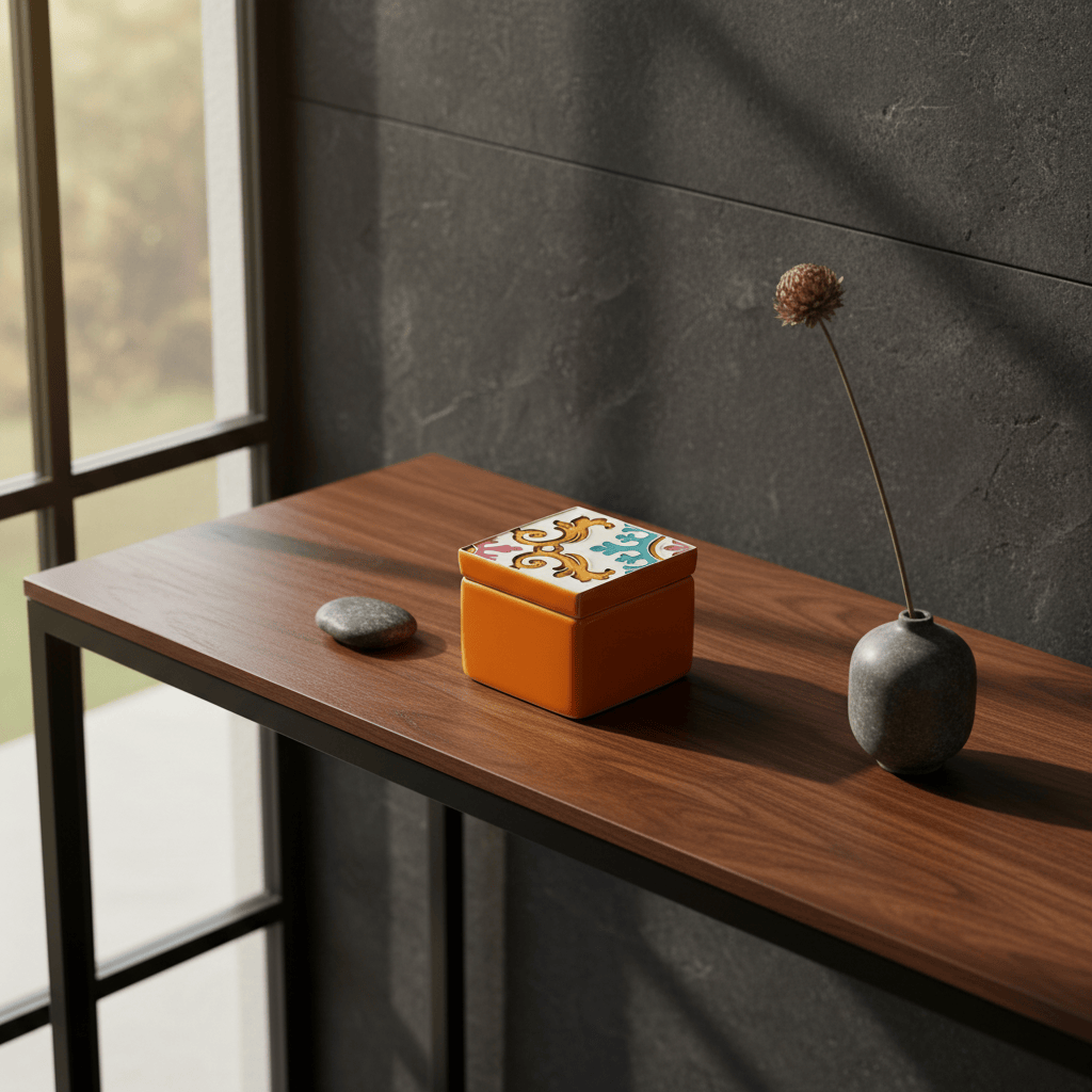 L'esthétique de cette boîte puise ses racines dans la tradition des azulejos hispano-mauresques, un savoir-faire séculaire introduit dans la péninsule Ibérique dès le XVe siècle. Ces motifs, caractérisés par leurs entrelacs géométriques et leurs couleurs puisées dans la terre et la mer (ocre, bleu, vert), étaient destinés à habiller la lumière.