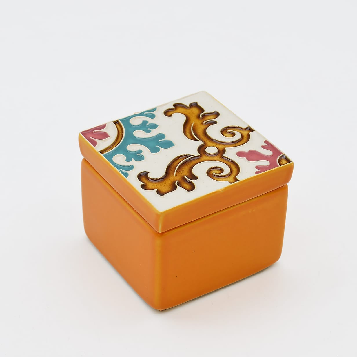 Cette petite boîte en céramique séduit par son contraste saisissant : un corps orange profond profond, couronné par un couvercle aux motifs hispano-mauresques vibrants.