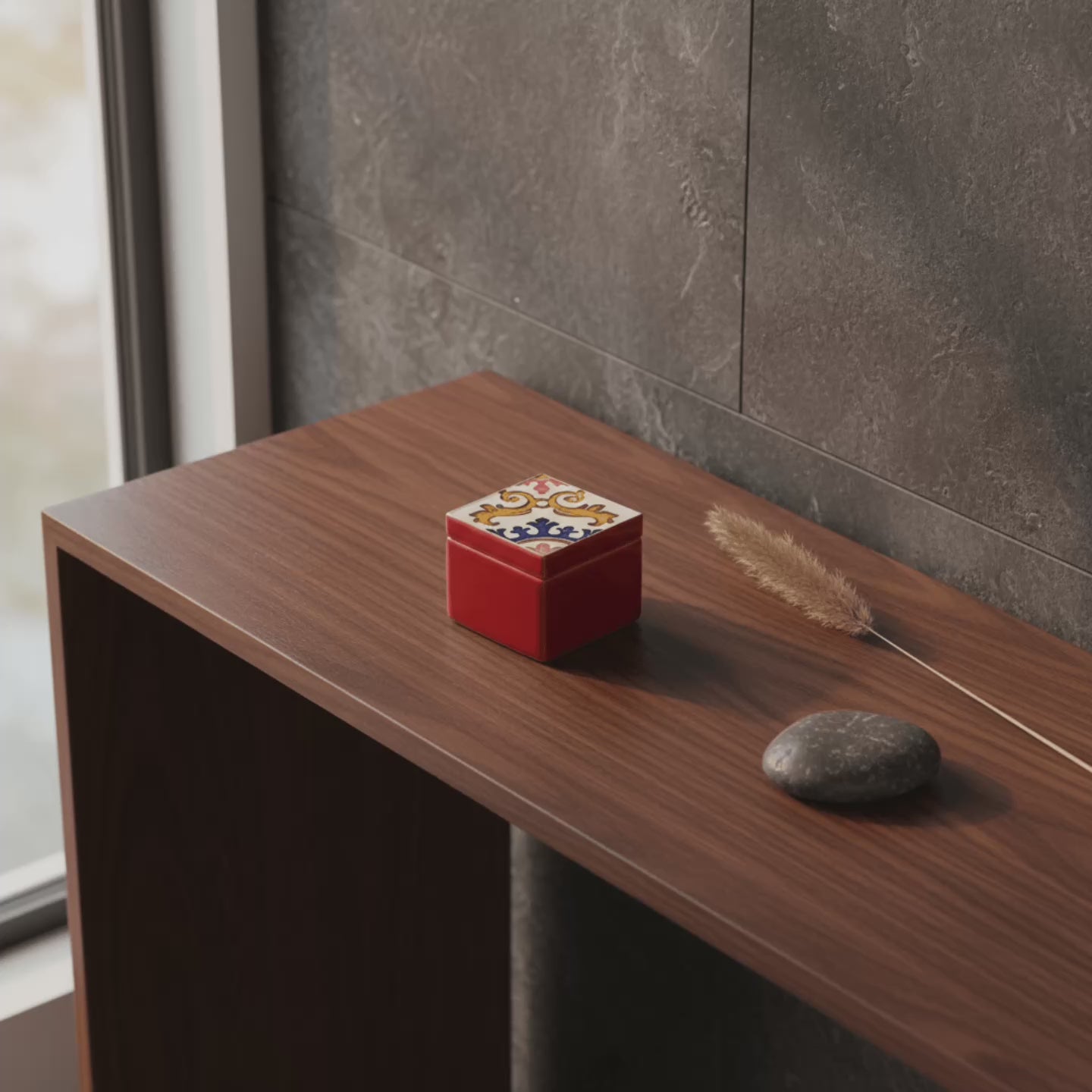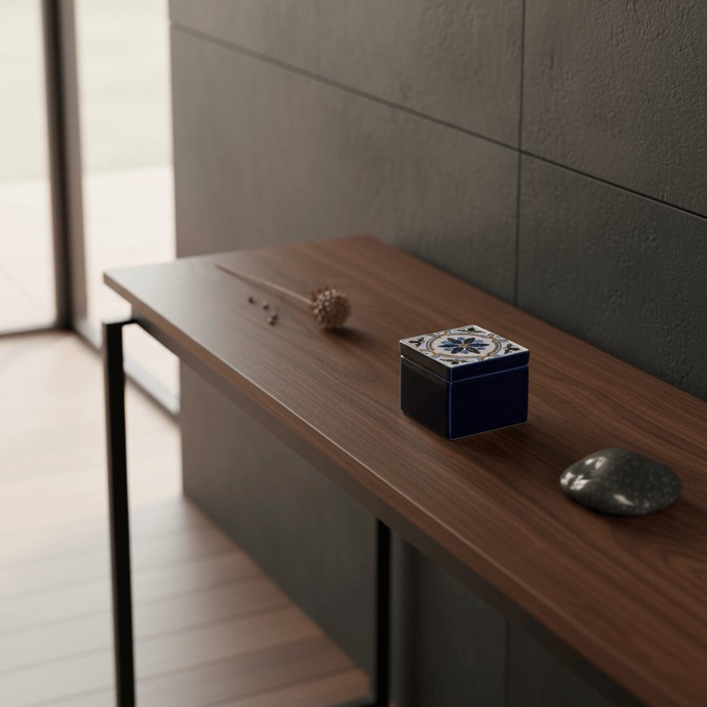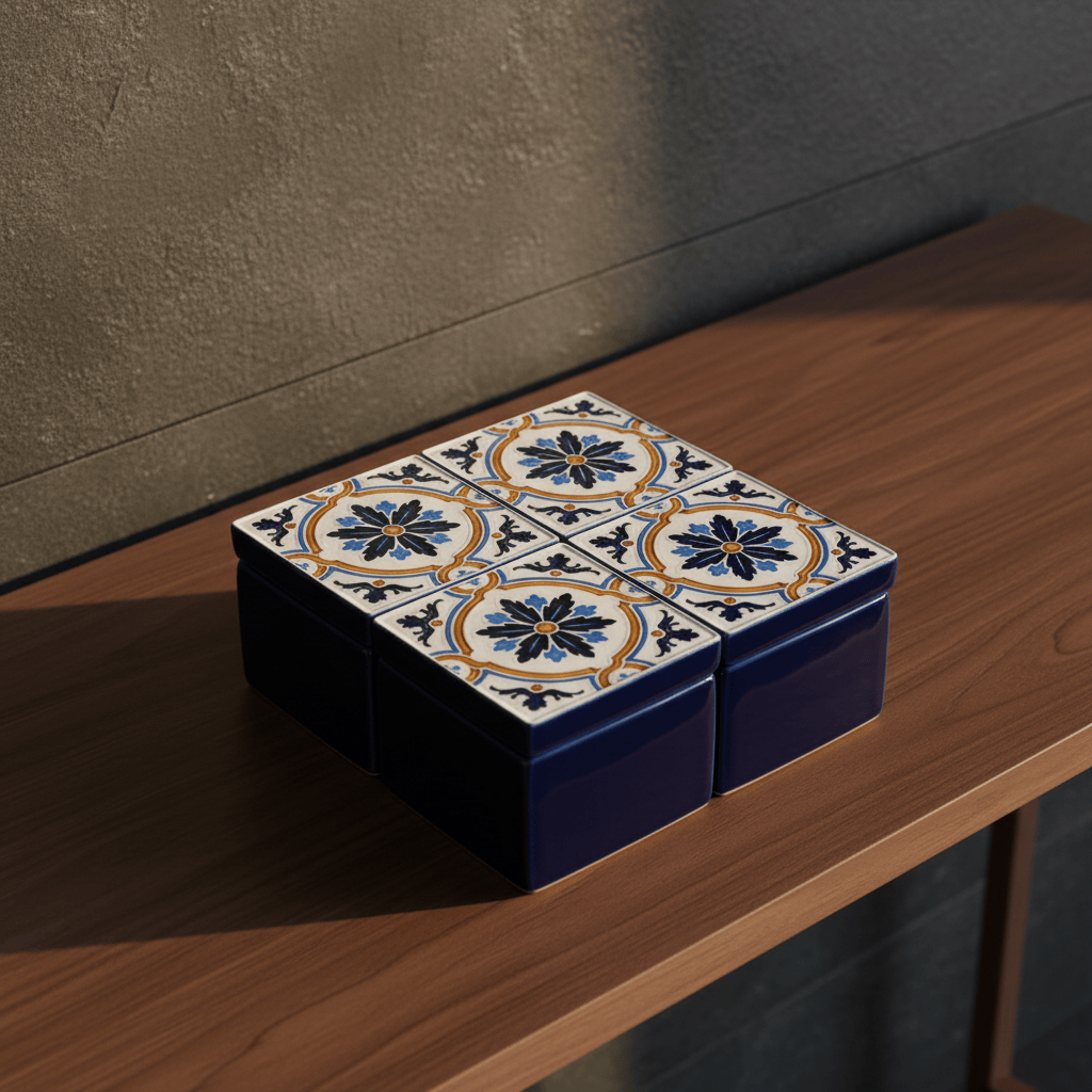 L'esthétique de cette boîte puise ses racines dans la tradition des azulejos hispano-mauresques, un savoir-faire séculaire introduit dans la péninsule Ibérique dès le XVe siècle. Ces motifs, caractérisés par leurs entrelacs géométriques et leurs couleurs puisées dans la terre et la mer (ocre, bleu, vert), étaient destinés à habiller la lumière.