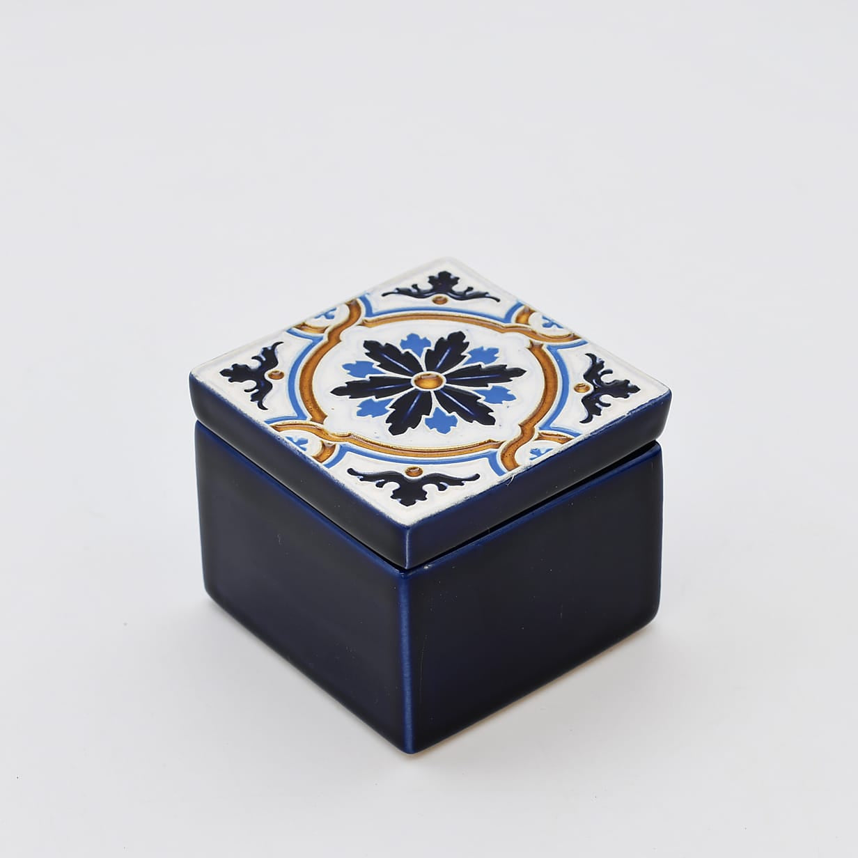 Cette petite boîte en céramique séduit par son contraste saisissant : un corps d'un bleu cobalt profond, couronné par un couvercle aux motifs hispano-mauresques vibrants.