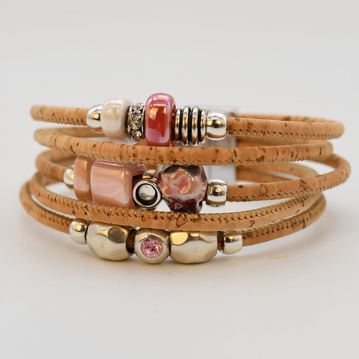 Il est composé de cinq lanières de liège naturel souple, enroulées autour du poignet pour un effet manchette élégant. Il est orné de perles variées aux reflets nacrés et aux couleurs douces ainsi que d’éléments en métal argenté. Le fermoir magnétique métallique assure une fermeture sécurisée et facile.