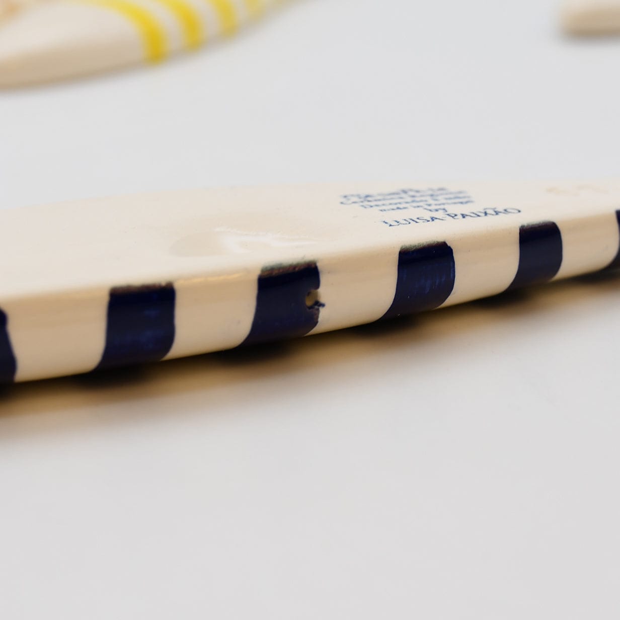 Symbole incontournable du Portugal, cette sardine en céramique artisanale rayée noire et blanche revisite avec élégance l’icône des fêtes populaires de Lisbonne.