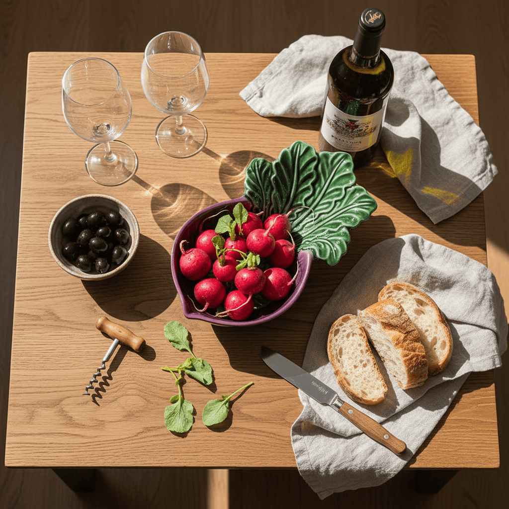 Façonnée en forme de radis, cette coupe au dessin est expressif et joyeux, apporte du relief et du caractère à la table, sans en faire trop.