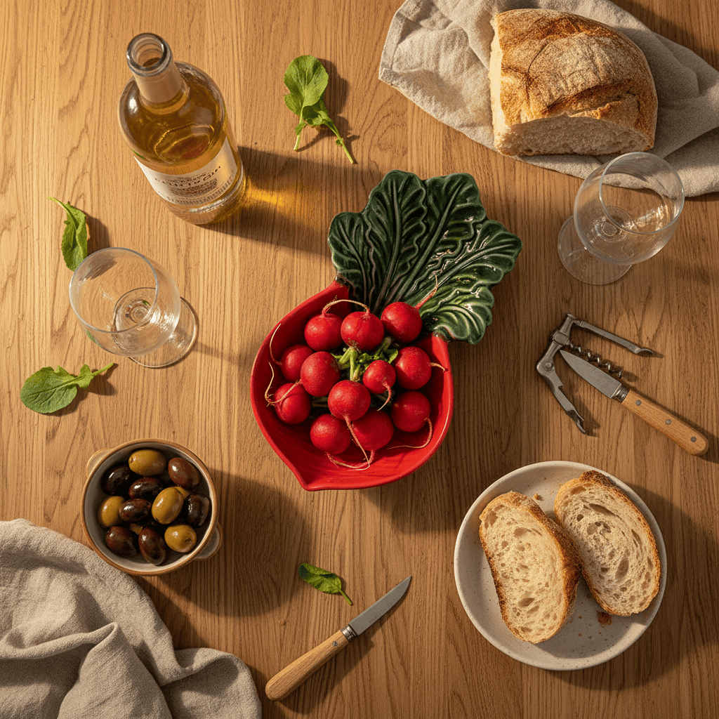 Façonnée en forme de radis, cette coupe au dessin est expressif et joyeux, apporte du relief et du caractère à la table, sans en faire trop.