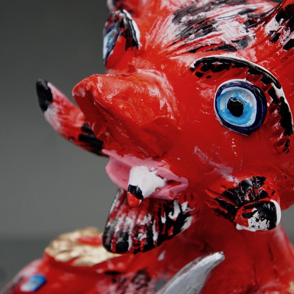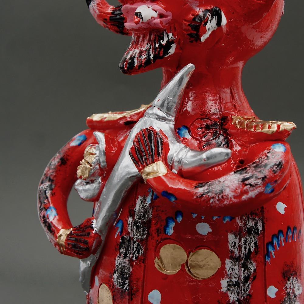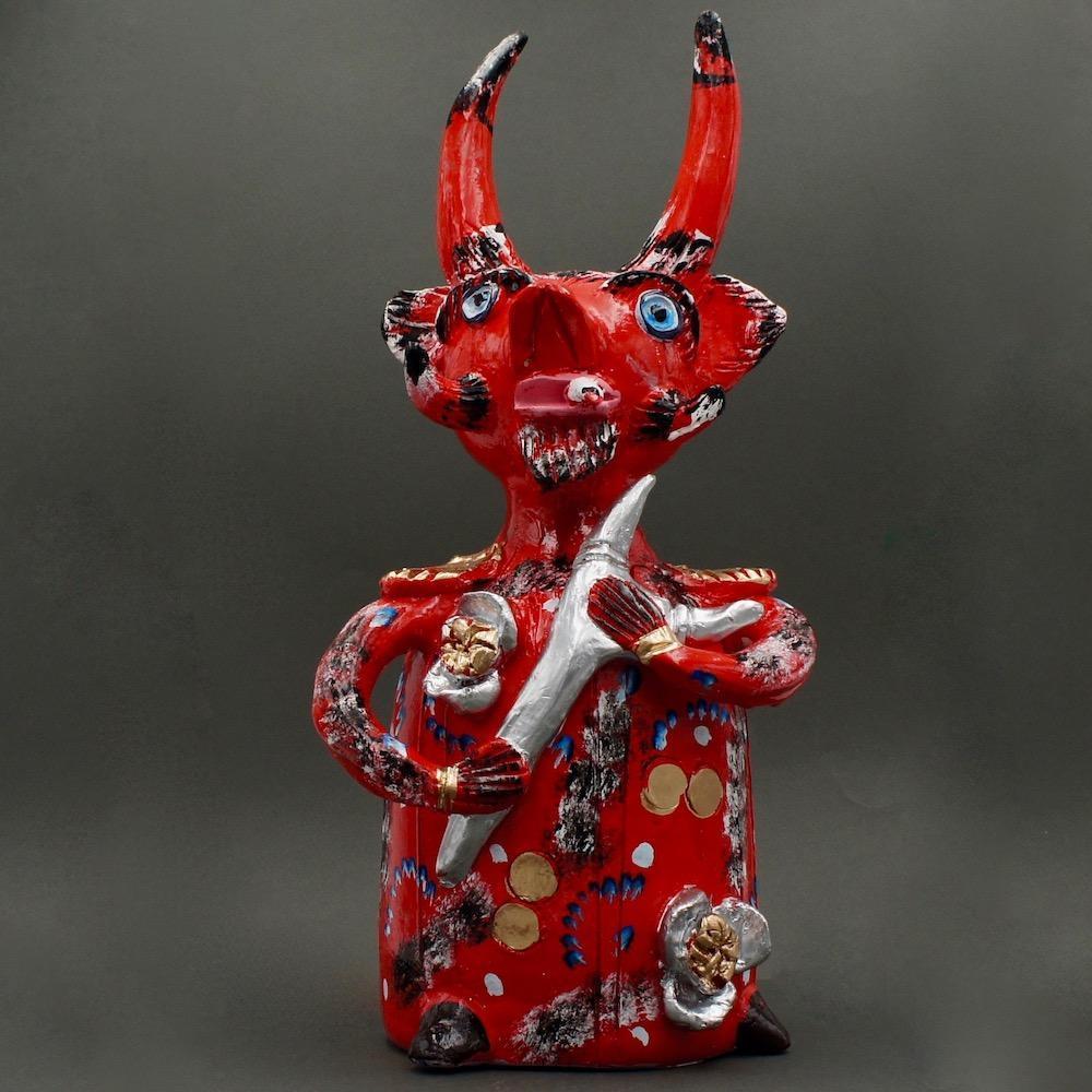 Cette statuette incarne le Diable tel qu’on l’imagine dans les terres profondes du Minho, berceau ancestral du Portugal : rouge flamboyant, paré de mille ornements, il brille d’une malice presque séduisante. Mais sous les doigts de Júlia Côta, il prend un air burlesque et décalé — un démon espiègle, presque rieur, qui arbore nonchalamment une cigarette aux lèvres. Un clin d’œil irrévérencieux, à la frontière du sacré et du profane.