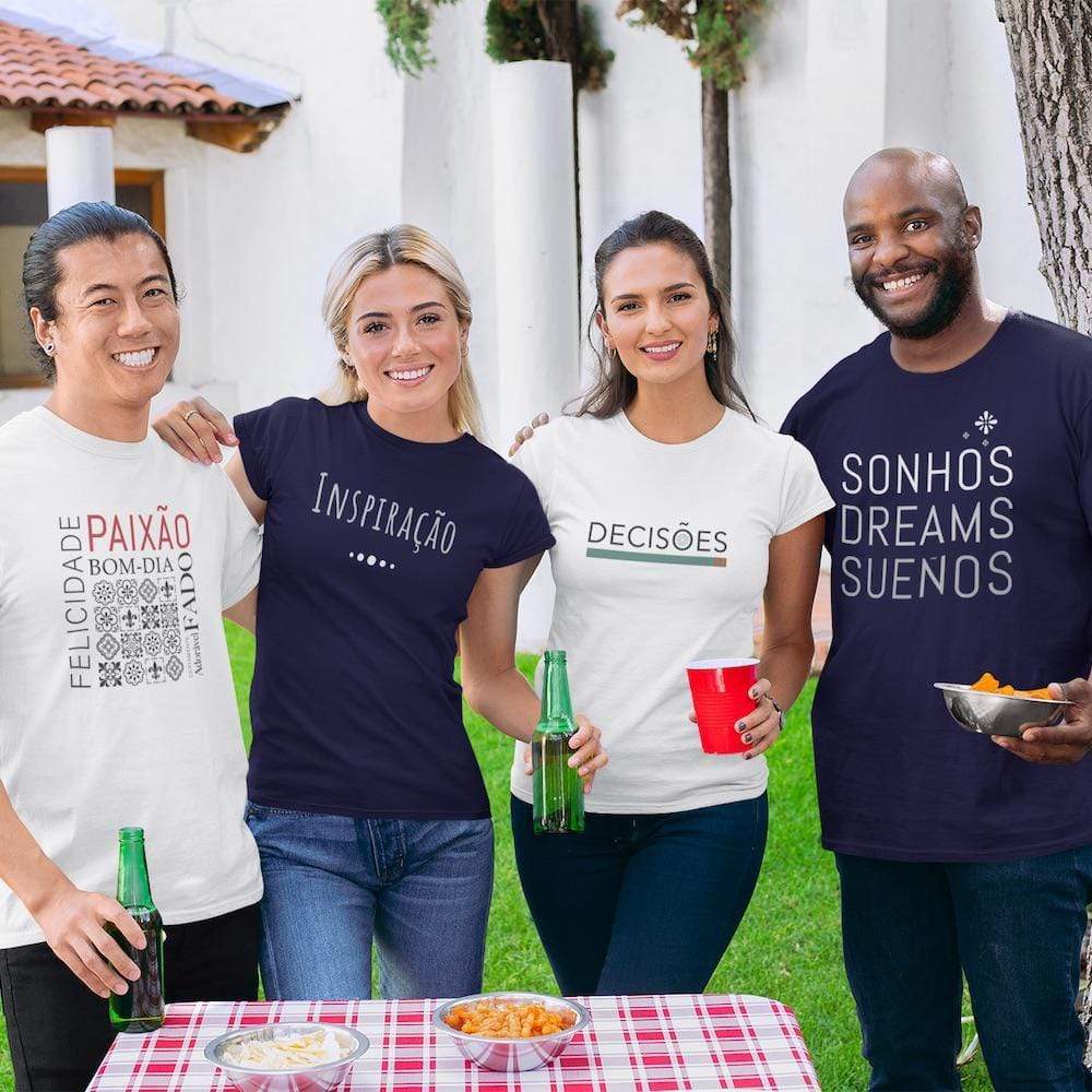 Tee-shirt bleu marine pour femme, de coupe moderne et cintrée, avec une illustration exclusive créée pour Luisa Paixão. L'illustration est composée du mot "Inspiracão" (Inspiration en portugais)