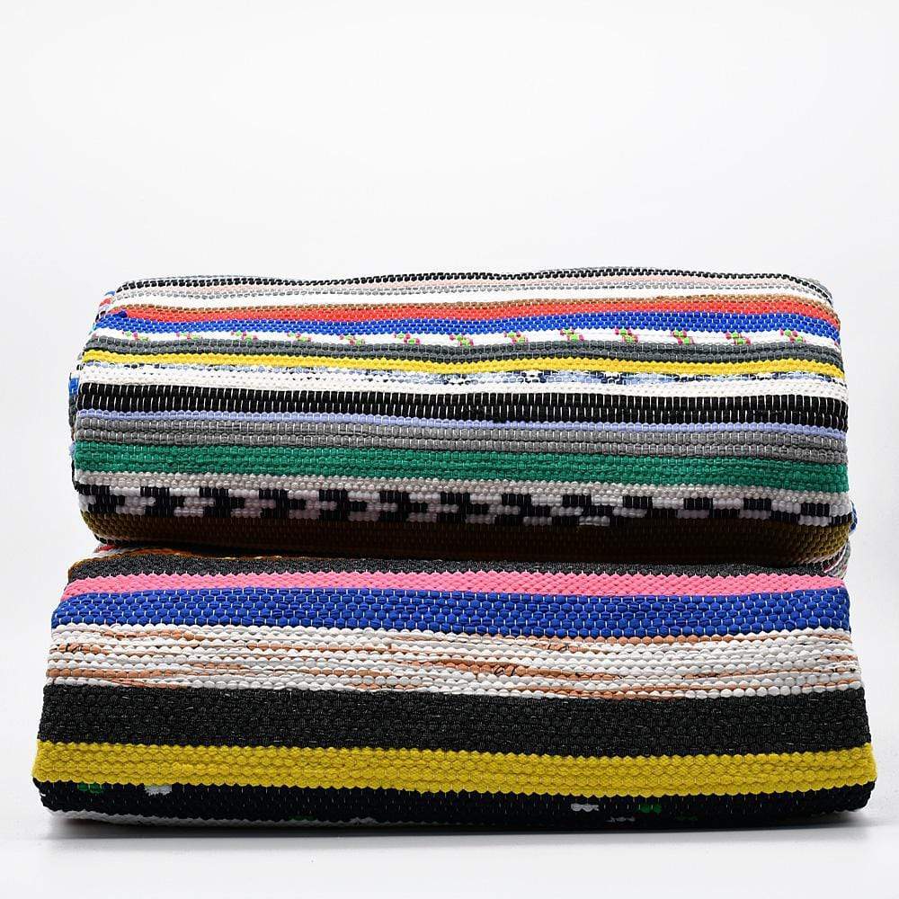 Ces tapis en fibres de coton mélangées sont tissés en rayures fines ou en rayures larges.