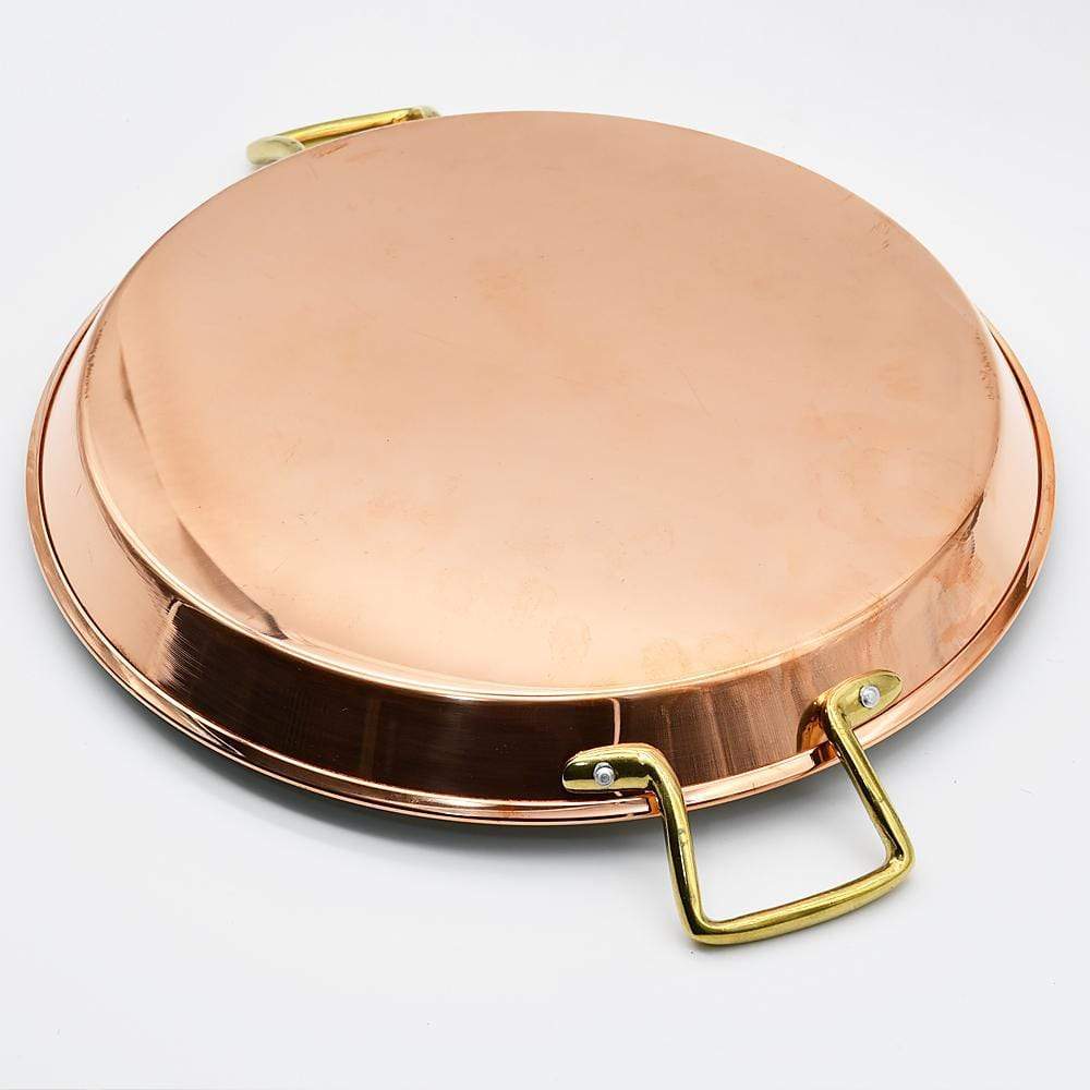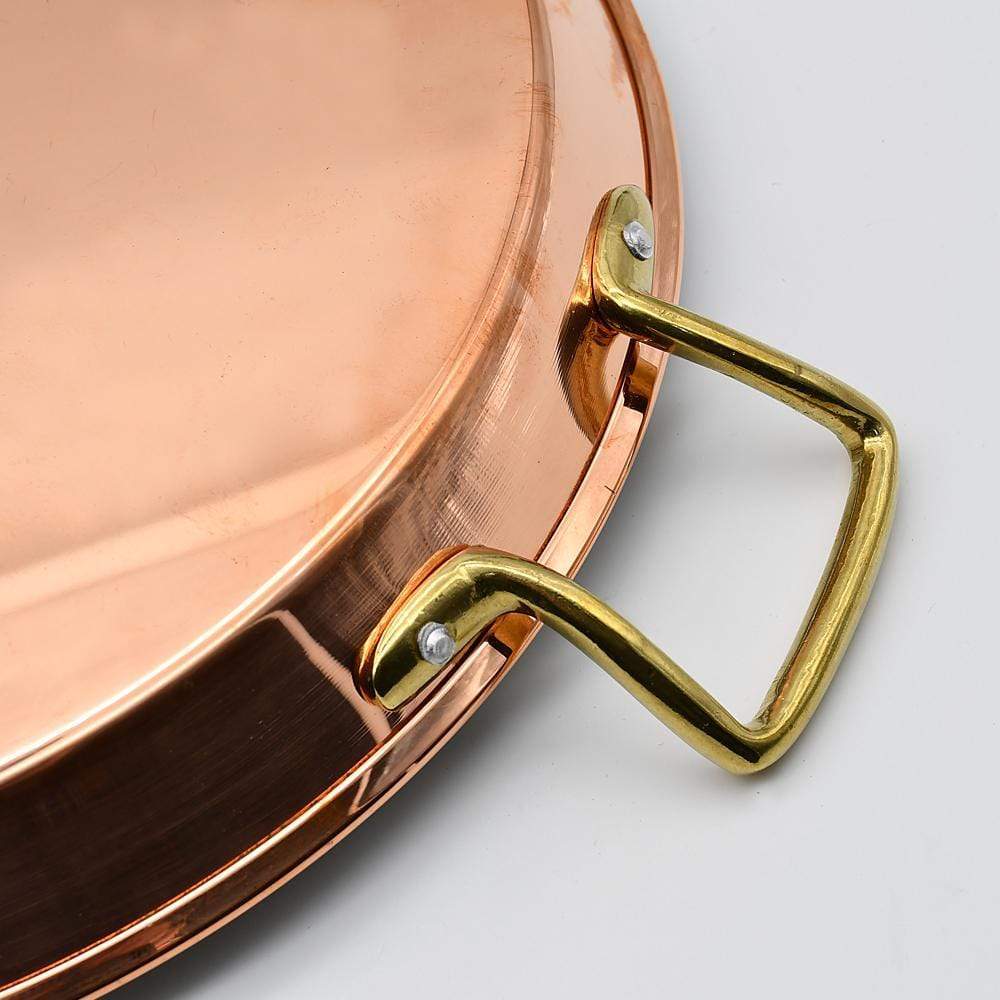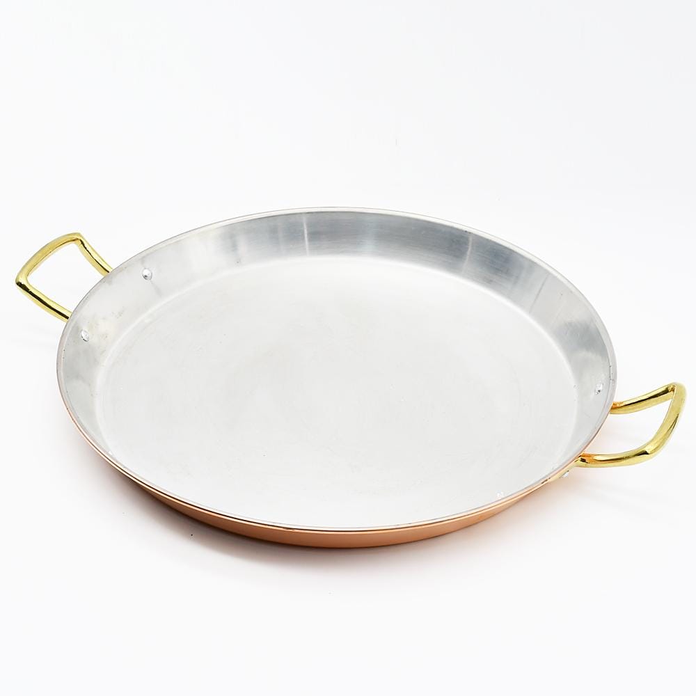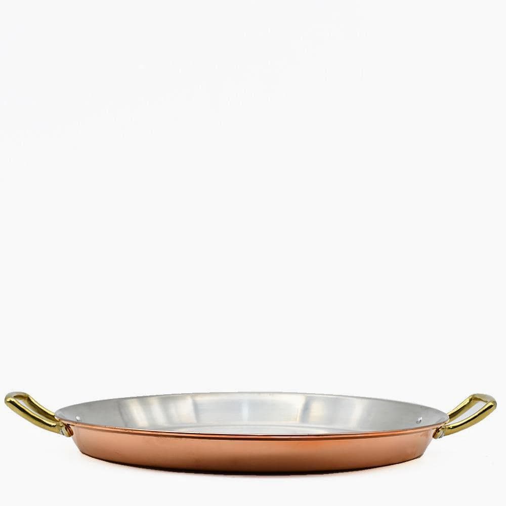 Ce plat à paella en acier inoxydable, recouvert de cuivre et équipé de poignées en bronze, fabriqué artisanalement est un ustensile haut de gamme privilégié par les professionnels pour sa qualité de cuisson et sa robustesse. Parfait pour des feux à gaz ou électriques, il est également adapté à la cuisson au four.