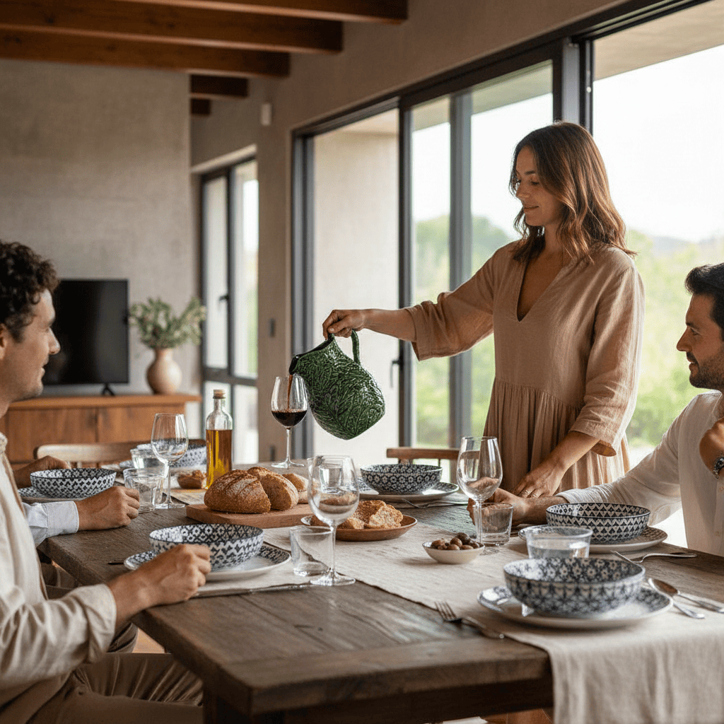 Cette carafe en céramique de grande contenance évoque instantanément les verres qui tintent, l'eau fraîche, le thé glacé partagé à l’ombre, l’insouciance, l'esprit simple et vivant, tout droit venu du Portugal.
